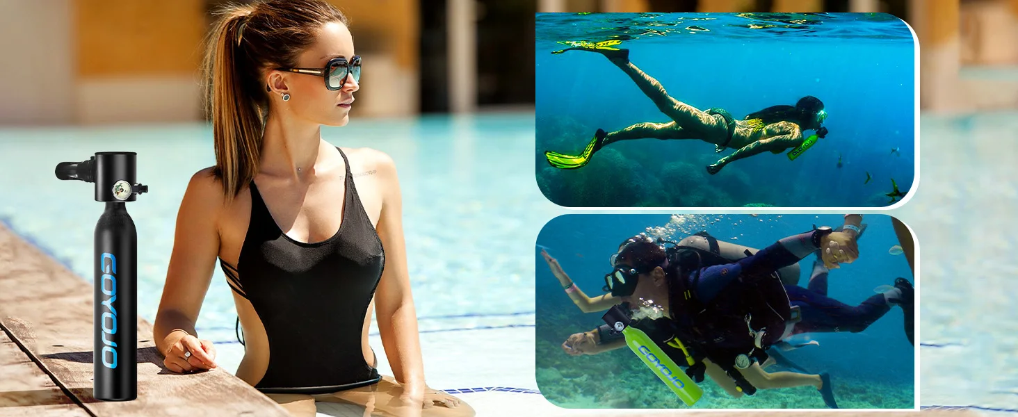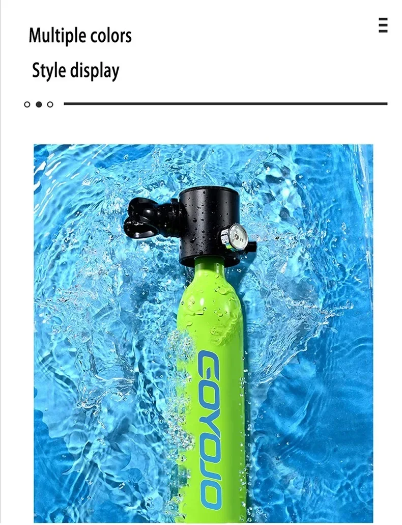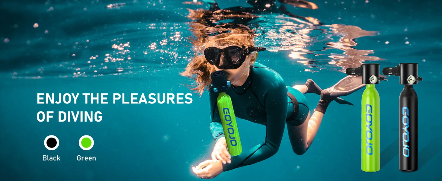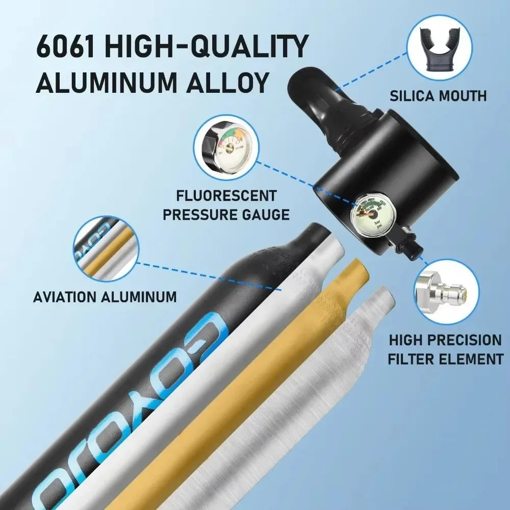 Portable Scuba Tank: Offers 6-12 minutes of submersion time with 0.5L oxygen cylinders. Suitable for a range of underwater depths, providing approximately 66 breaths for surface breathing.