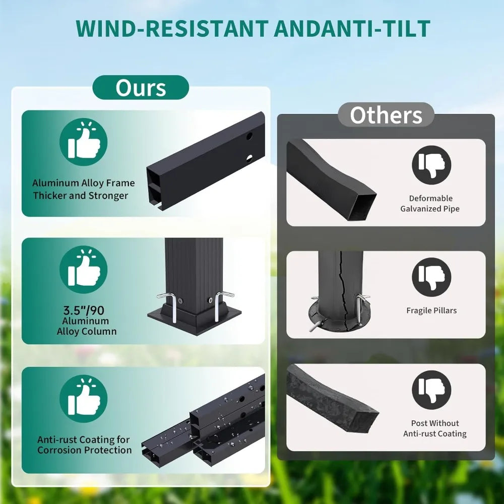 - 【Industrial Strength Aluminum Frame】 3.55"×3.55" powder-coated aluminum posts withstand coastal storms and mountain snow. Reinforced joints provide unmatched stability for climbing plants, hanging lights, or heavy decorations.