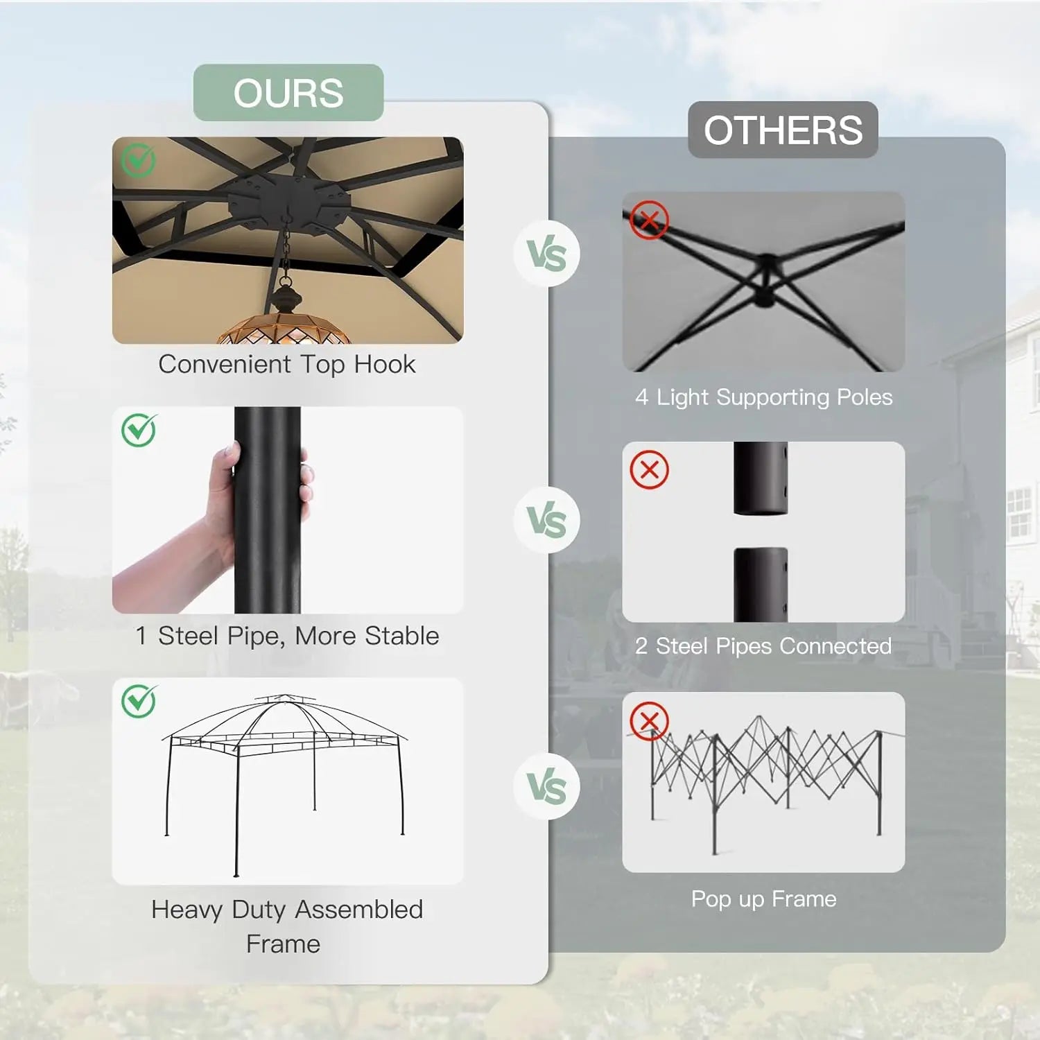 - Sturdy Frame: outdoor gazebo is built with a powder-coated steel frame that resists rust and corrosion. The top is supported by 8 steel poles and comes with 8 ground stakes to maintain stability in various weather conditions for long-term use