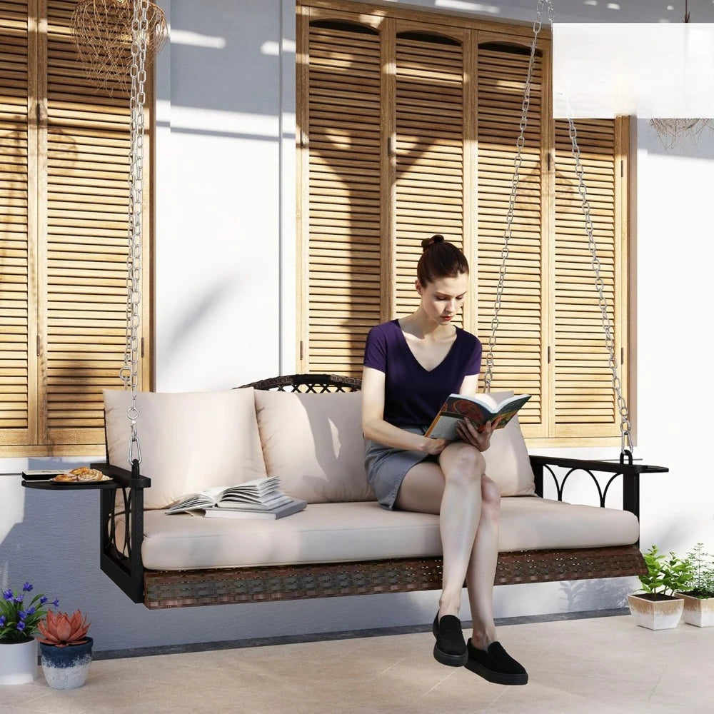 3 Person Wicker Porch Swing Chair Heavy Duty 800 LBS with Cup Holder, 57 Inch Outdoor Rattan Patio Hanging Swing Bench