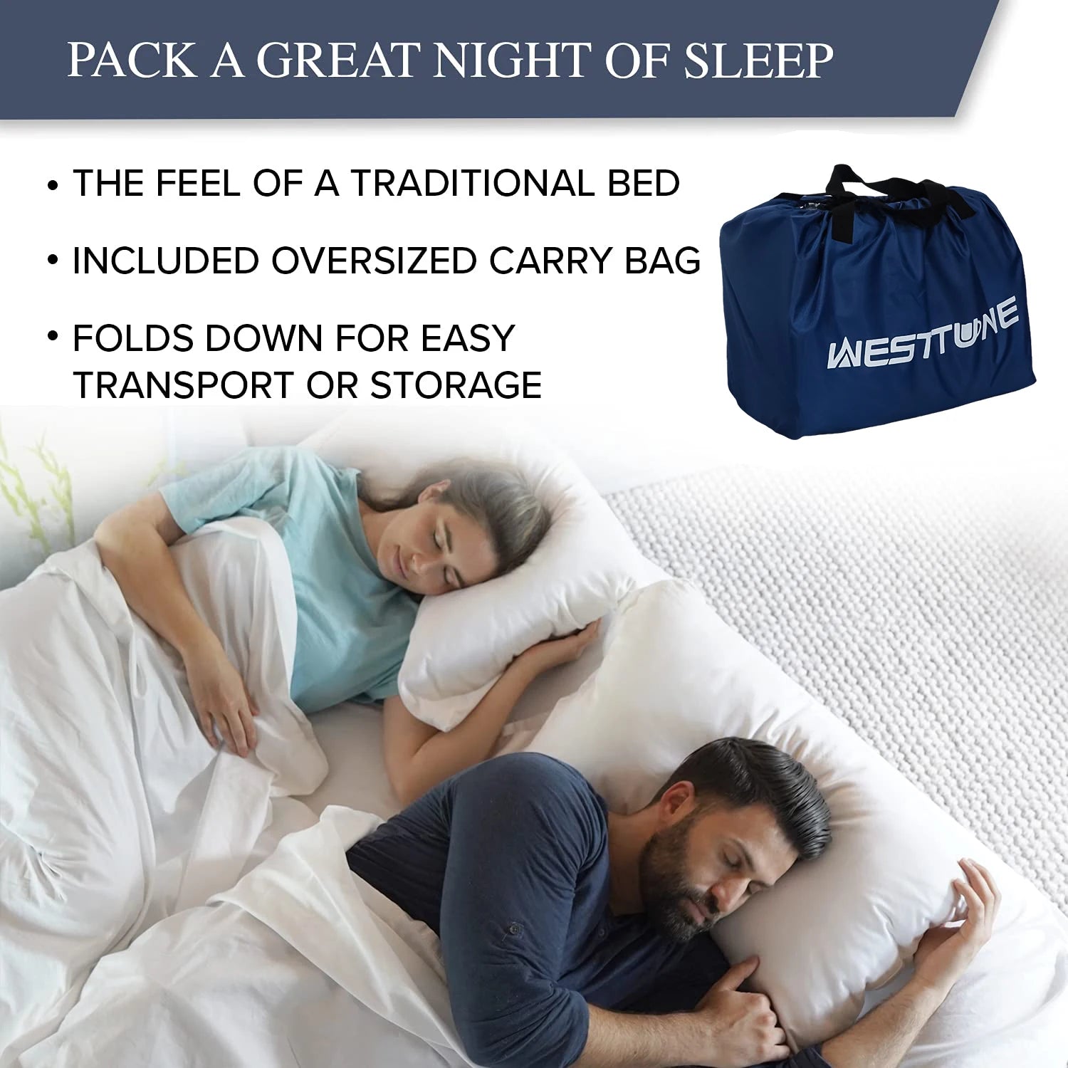 WESTTUNE LUXURY QUEEN AIR MATTRESS: Experience unparalleled comfort with our Queen-sized airbed, featuring a luxurious pillow top, soft flocking layer and enhanced coil-beam construction for maximum support. Built to last with durable, waterproof, and puncture-resistant materials, this air mattress is your go-to solution for a restful night's sleep.