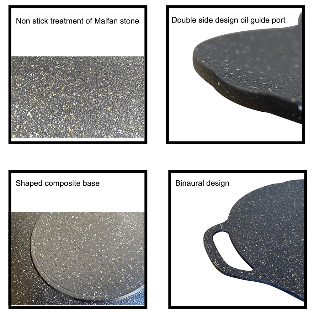 Feature: 1. Healthy materials: The healthy material has no peculiar smell, and the surface of the pot body has convex particles, which reduces the contact surface of the food and achieves physical non-stickiness. 2. Balanced heating: Balanced heating, rapid and uniform heat conduction, fast heating on the pot body, uniform heat conduction, and can be used on a variety of stoves. 3. Design: The outer high and inner low design, do not run out of oil, do not splash oil, the center is fried and fried, and the surrounding barbecue is correct. 4. Multi-purpose: Fried, roasted, multi-purpose, one pot is multi-purpose and delicious, and it is enough to bring it with you for outdoor picnics. 5. Use Occasions: A variety of uses. It is suitable for frying, roasting and frying at home and in the wild. It is suitable for open flames, such as cassette stoves and wood stoves! Specification: Origin: Mainland China Type: Pans Pans Type: Griddles & Grill Pans Wok type: Non-stick Material: aluminum alloy + medical stone Colour: Black Size: Diameter: 29cm/11.4in (including two ears 34cm/13.4in), Diameter 33cm/13in (including two ears 39cm/15.3in), Diameter 36cm/14.2in (including two ears 43cm/16.9in) Thickness: 2mm/0.07inch Applicable stove: gas stove, alcohol stove, etc Note: Due to the different monitor and light effect, the actual color of the item might be slightly different from the color showed on the pictures. Thank you! Please allow 1-2cm measuring deviation due to manual measurement. ![]()
