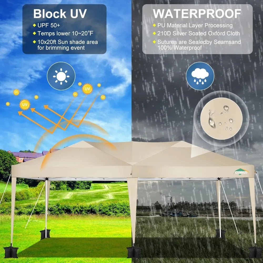 - Waterproof & Anti-UVThe top of pop up canopy tent 10x20 is made of the 210D oxford cloth, silver & PU(2000) coated, and all seams are high density sewing and processed by waterproof material under high-temps & pressure. 10x20 Wedding tent gazebo waterproof pressure reaches 1000 Pa, it's great coverage and shade in sunny or rainy days.