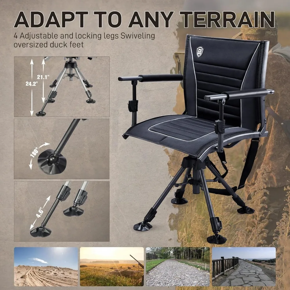 - ADAPT TO ANY TERRAIN: The ground blind chair combines stability and comfort. The strong and sturdy adjustable 4 legs base with large swivel feet have a good grip to prevent sinking if the ground is muddy or not flat
