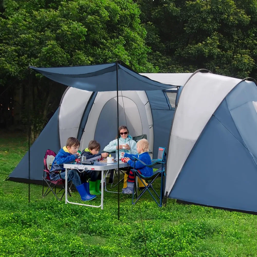 This product features a durable polyester fabric with a 190T rating, reinforced with PU2000mm and fully taped sealed seams, ensuring a waterproof and comfortable shelter for your family during camping trips. The tent is supported by sturdy fiberglass poles for added stability and longevity. Designed as a family tent with a screen porch, it includes two separate bedrooms and a central living area, providing ample space for sleeping, socializing, and storing gear. The sleeping areas are located on both sides with a living room in the middle, which can accommodate comfortable seating, a dining table, and storage solutions. The overall dimensions of the tent, including the porch, measure 177.2 x 86 x 70.8 inches. The tent's vestibule can be utilized as a covered area for outdoor activities such as dining, cooking, and socializing, or for storing equipment. The central living room can also serve as a relaxation zone, perfect for placing camping chairs and inflatable mattresses for comfortable lounging. It's an ideal spot to unwind, read, nap, or simply enjoy the serenity of nature. For optimal ventilation and breathability, the tent is equipped with a mesh window, two side vents, and two D-shaped doors, allowing you to take in the beautiful views and fresh air. The high-density mesh ensures excellent airflow, while the high-quality two-way zippers allow for easy adjustment of airflow and temperature, promoting a restful sleep. The multifunctional porch tent offers 70% more outdoor space compared to a standard 4-person tent, providing a living area for relaxation and gear storage. It also functions as a sunshade canopy, offering ample shade on hot days with good ventilation and clear views, enhancing your outdoor experience.