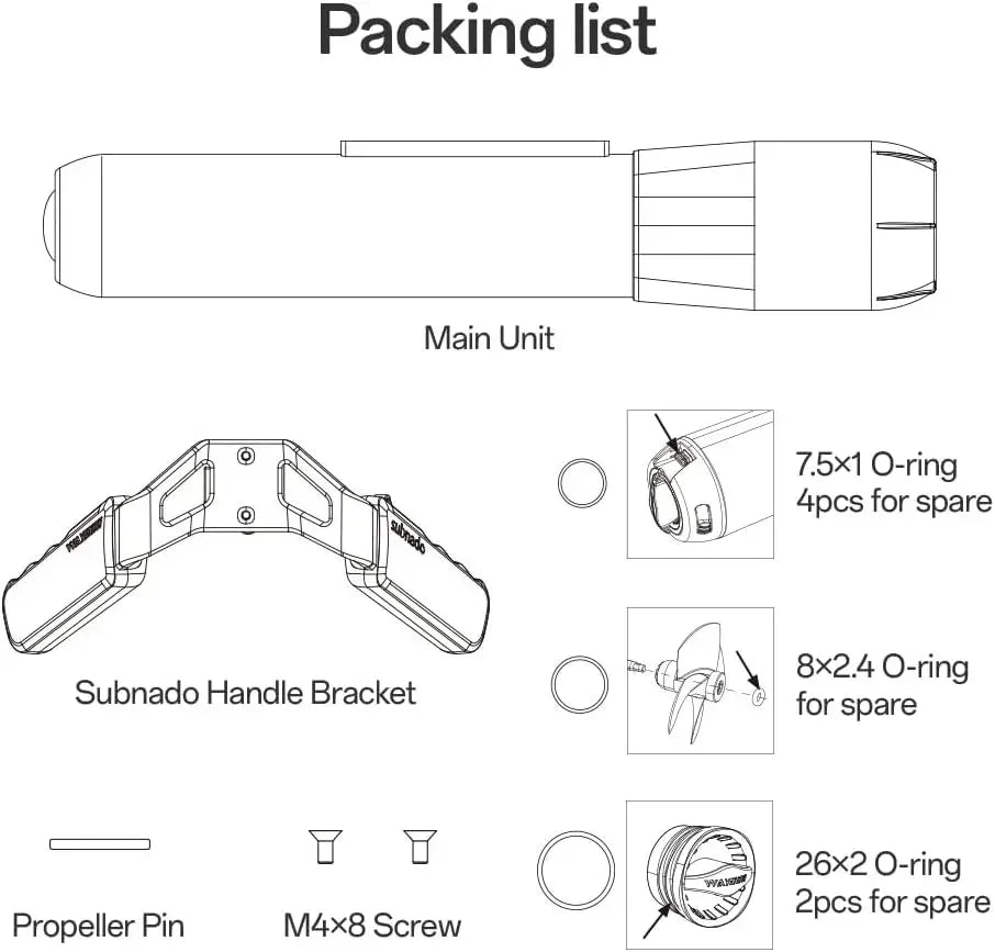 Subnado Lite Includes: The Subnado Lite Set included Subnado Main Unit*1, Subnado Handle Bracket*1, Propeller Pin, Screws and several different sizes of O-rings for spare. Streamlining optional accessories, more convenient to carry.