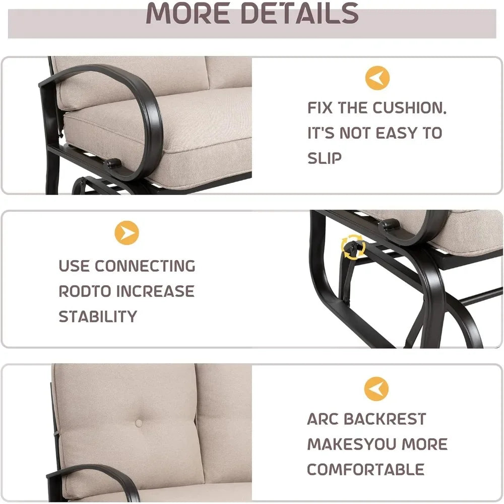 Sturdy and Durable: It can support two people up to 500lbs in total. Durable wrought iron frame for a long time use. Use connecting rod to increase stability. The patio glider is a great addition to your porch, balcony, garden, patio, backyard or any indoor and outdoor entertaining area. It is ideal for relaxing, sleeping, and entertaining.