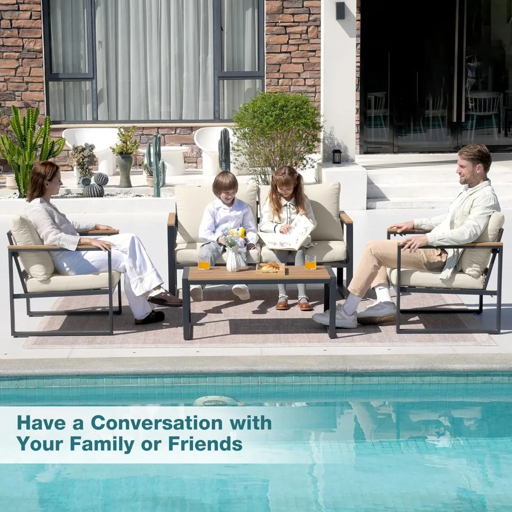 Patio Furniture Set, 4 Pieces Outdoor Patio Furniture with Coffee Table Set, Metal Patio Conversation Sets with Washable and Hig