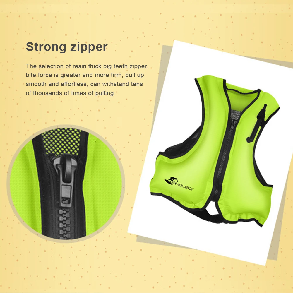 Note: Inflatable Snorkeling Vest Adjustable Water Sports Safety Vest Breathable Inflatable Buoyancy Vest for Snorkeling Swimming Kayaking Boating Features: 1.Comfortable and Sturdy Material: Made with polyester outer and 0.25PVC inner, this inflatable snorkeling vest offers superior airtightness and durability compared to standard life vests, ensuring a fun and safe experience. 2.Quick Inflation System: Equipped with a portable swim jacket nozzle, this vest features a fast inflation system that is easy to use, tightly sealed, and specifically designed for snorkeling enthusiasts. 3.Reinforced Zipper Design: Featuring an all-resin thickened large-tooth zipper, the swimming life vest ensures greater bite force and secure closure, offering smooth operation even after countless zips. 4.High-Strength Adjustable Straps: The water sports safety vest includes high-strength adjustable straps and secure buckles that will not break or loosen, providing peace of mind during use. 5.Breathable Mesh Design: The upper part of the inflatable buoyancy vest features breathable mesh fabric for comfort and reduced friction, while the lower part has ultra-thin coated fabric for a snug fit. Specification: Origin: Mainland China Material: Polyester + PVC Color: Fluorescent Green Size: 58cm/22.83in*49cm/19.29in Crowd: General Use: Swimming, Rafting, Paddle Board, Kayaking, etc.