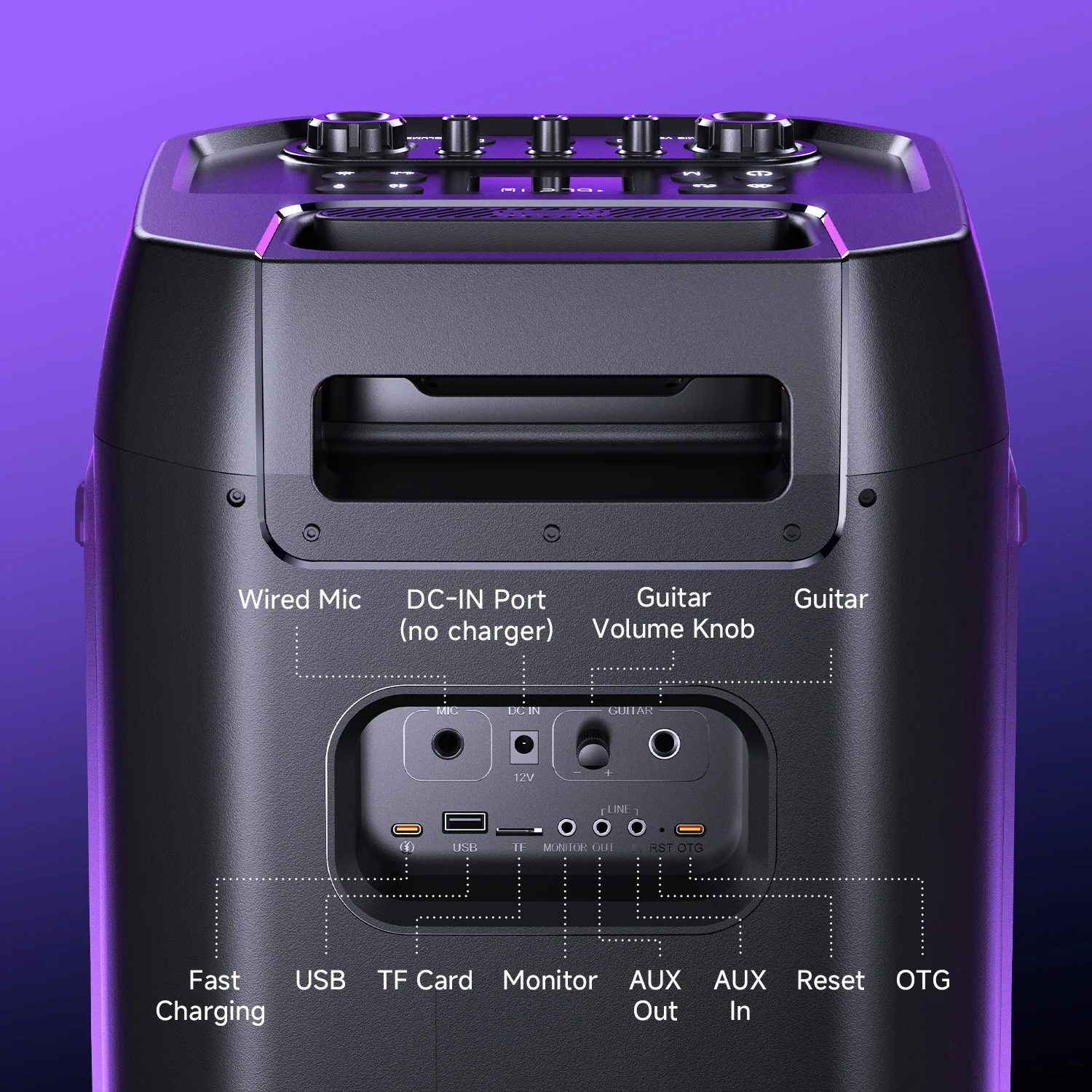 Microphone and Guitar Input: The T12 Bluetooth speaker supports 6.35 mm inputs for guitar/microphone (dynamic microphone only) and also works with wireless microphones via a 6.35 mm receiver (not included). The guitar and microphone have independent volume and echo controls for precise sound adjustment. Whether you're jamming, hosting, or singing, switch between 4 powerful modes—Original, Pro, Pop, or Karaoke—to suit your mood. The outdoor speaker's integrated telescopic handle and smooth-rolling wheels make it easy to roll—perfect for parties, travel, or outdoor events.